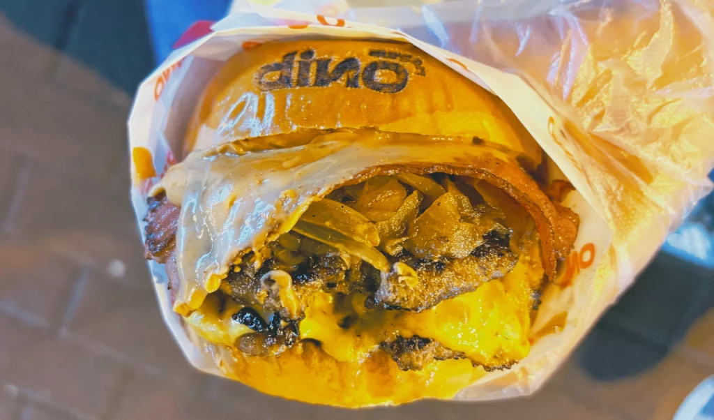 For a quick bite, try the Dino Hamburger. It’s packed with juicy meat and rich peanut butter!