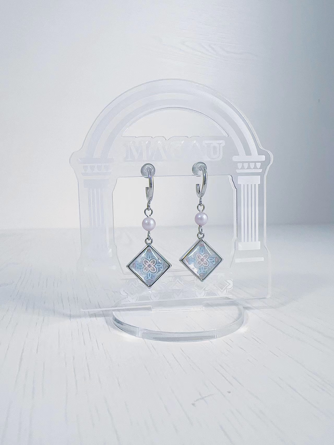 材质:医疗钢针,天然白蝶贝,奥地利swarovski人造珍珠,滴胶